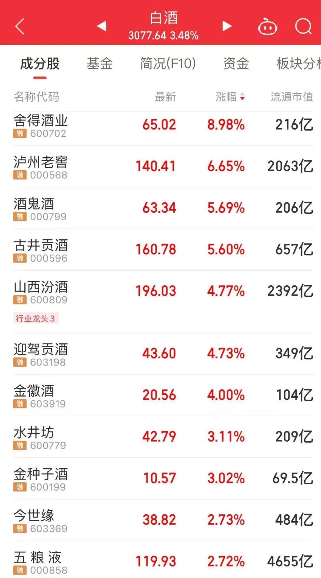 乳业、旅游酒店、白酒等板块也大涨。白酒板块中,个股全线上涨,泸州老窖、舍得酒业等个股涨幅居前。