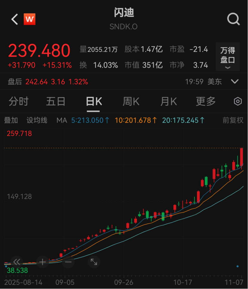 近日,闪迪公布的2026财年第一财季(截至2025年10月3日)业绩超出市场预期,刺激该公司股价在11月7日大涨超15%,总市值创历史新高至351亿美元。今年年初以来,闪迪股价累计涨幅超过560%。