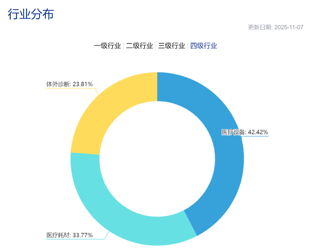 中证指数官网数据显示,医疗器械指数ETF(159898)跟踪中证全指医疗器械指数,权重中医疗设备含量42.42%、医疗耗材占比33.77%、体外诊断占比23.81%。