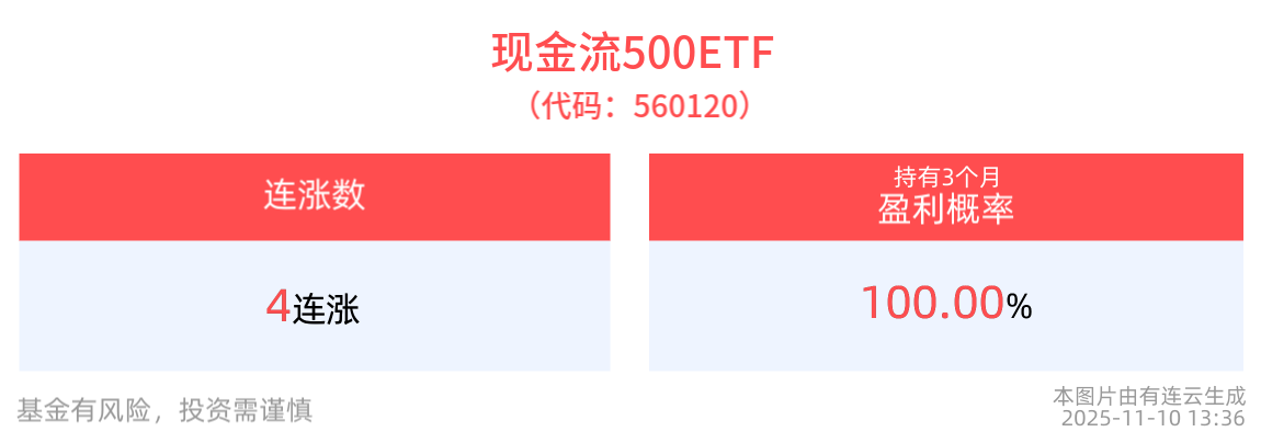 从收益能力看,截至2025年11月7日,现金流500ETF自成立以来,最高单月回报为7.97%,最长连涨月数为3个月,最长连涨涨幅为15.21%,涨跌月数比为3/0,上涨月份平均收益率为4.86%,月盈利百分比为100%,月盈利概率为100%,历史持有3个月盈利概率为100%。