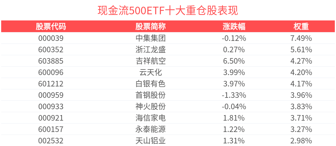 数据显示,截至2025年10月31日,中证500自由现金流指数前十大权重股分别为中集集团、浙江龙盛、白银有色、神火股份、云天化、吉祥航空、首钢股份、海信家电、天山铝业和永泰能源,前十大权重股合计占比45.9%。
