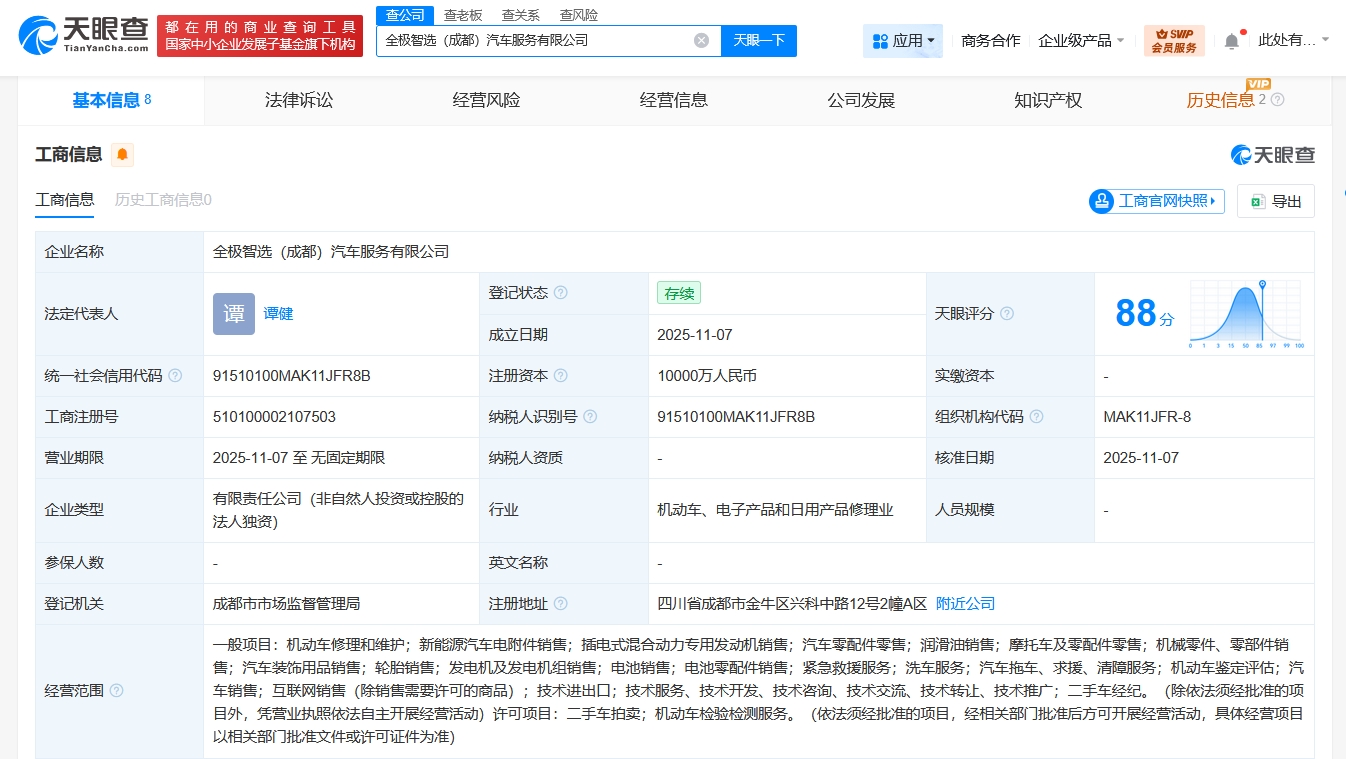 南方财经11月10日电,天眼查工商信息显示,近日,全极智选(成都)汽车服务有限公司成立,法定代表人为谭健,注册资本1亿人民币,经营范围含机动车修理和维护、新能源汽车电附件销售、插电式混合动力专用发动机销售、汽车零配件零售、润滑油销售、摩托车及零配件零售、二手车经纪、二手车拍卖等。股权全景穿透图显示,该公司由长城智选信息科技(保定)有限公司全资持股,后者为长城汽车(601633)全资子公司。