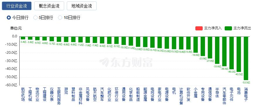 净流出方面,消费电子、电池、电子元件等净流出排名靠前,其中消费电子净流出53.55亿元。