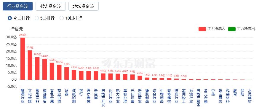 行业资金方面,截至收盘,酿酒行业、文化传媒、食品饮料等净流入排名靠前,其中酿酒行业净流入29.81亿。