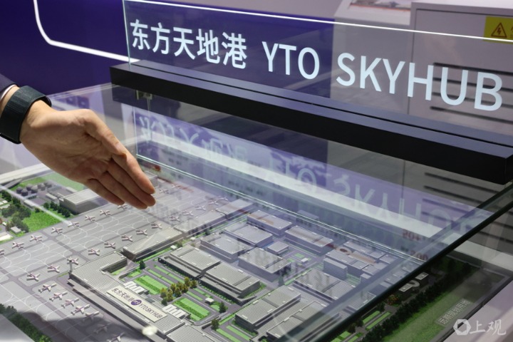 圆通展台中央,其全球航空物流枢纽“东方天地港”的沙盘模型引发中外客商关注。这座位于浙江嘉兴、占地1500亩的枢纽将于年底启用。