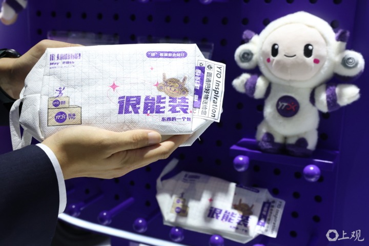 圆通新创吉祥物“圆紫”和“巨能装”环保购物袋,吸引大量观众前来领取。