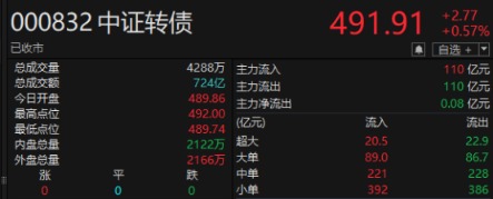 上证报中国证券网讯 11月10日,中证转债指数收盘涨0.57%,报491.91点,成交金额724亿元。东时转债、国城转债、中宠转2涨幅居前,分别涨20%、14.41%、6.62%;洛凯转债、惠城转债、银轮转债跌幅居前,分别跌8.61%、5.30%、4.44%。