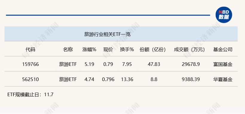 点评:旅游ETF(159766)和旅游ETF(562510)今日上午涨幅分别达到5.19%和4.74%,其中,旅游ETF(159766)份额达到47.83亿份,半日成交金额为2.97亿元,上述两只ETF追踪的是中证旅游主题指数。