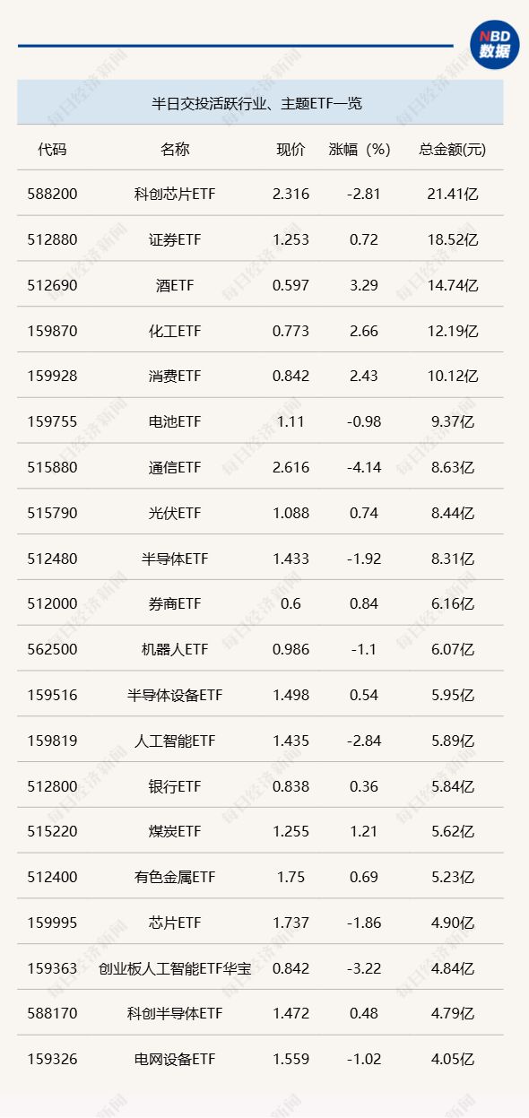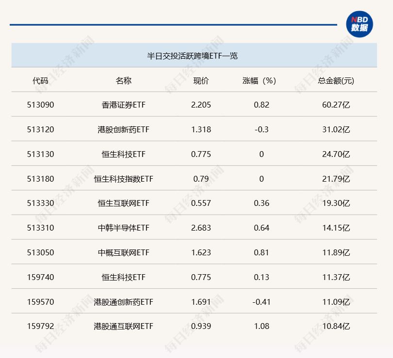 11月10日上午,半导体相关ETF交易活跃度明显下滑,而证券、化工、消费以及白酒类ETF交投活跃,相关ETF半日成交金额超过10亿元,跨境ETF方面,香港证券ETF(513090)半日成交金额达60.27亿元,依旧是跨境ETF交易最活跃的品种。