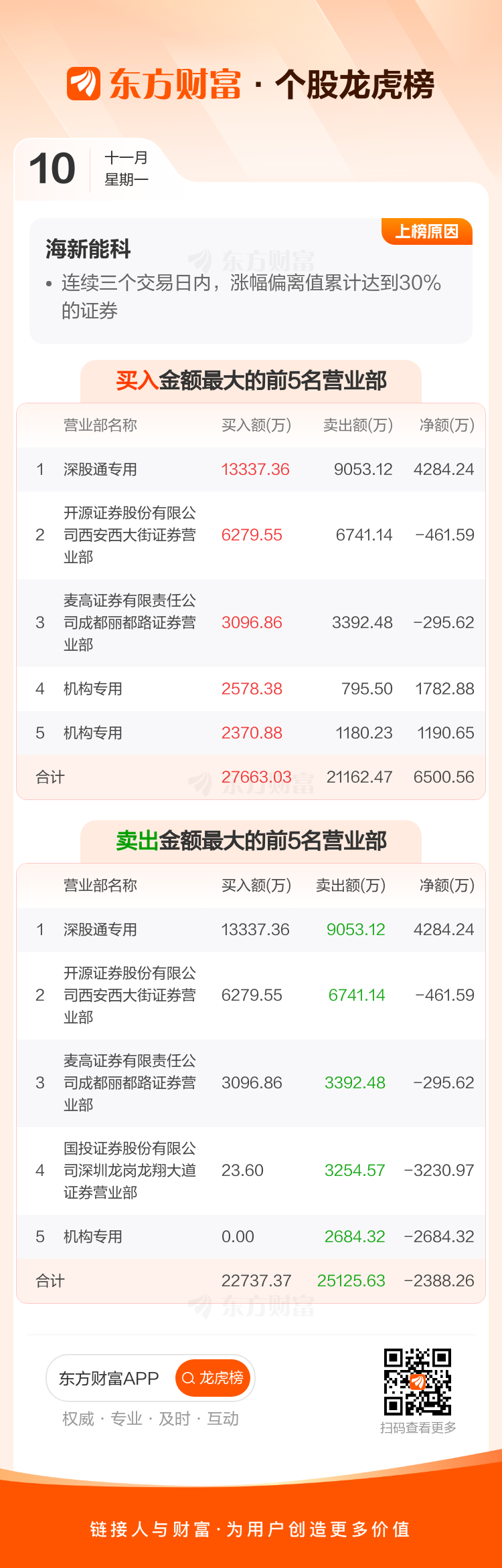 交易所2025年11月10日公布的交易公开信息显示,海新能科因成为连续三个交易日内,涨幅偏离值累计达到30%的证券上榜。海新能科当日收报5.52元,涨跌幅9.31%,换手率15.74%,成交额20.02亿。异常期间11月7日至11月10日,期间涨幅31.12%,累计偏离值31.80%,区间成交额29.76亿。