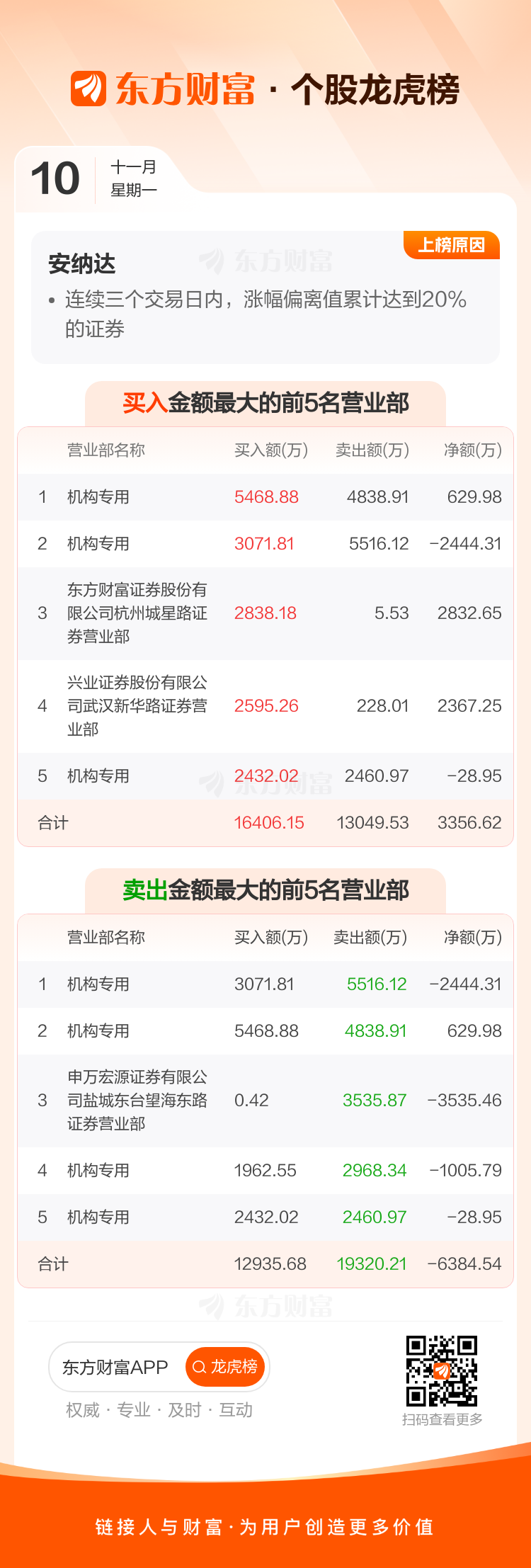 交易所2025年11月10日公布的交易公开信息显示,安纳达因成为连续三个交易日内,涨幅偏离值累计达到20%的证券上榜。安纳达当日收报15.63元,涨跌幅9.99%,换手率22.99%,成交额7.48亿。异常期间11月7日至11月10日,期间涨幅20.98%,累计偏离值20.88%,区间成交额16.23亿。