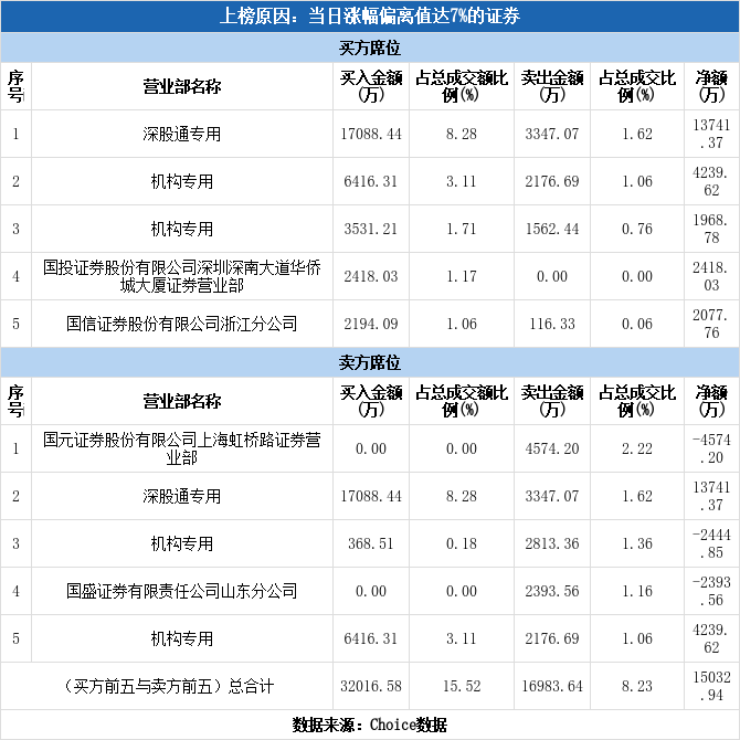 今日龙虎榜单上出现了深股通的身影,占据了买一、卖二的位置,净买入1.37亿元,占当日成交总额的6.66%。