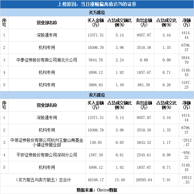 龙虎榜数据显示,今日共5个机构席位出现在龙虎榜单上,分别位列买二、买四、买五、卖二、卖五,合计净买入1.31亿元,占龙虎榜净买额的67.26%。