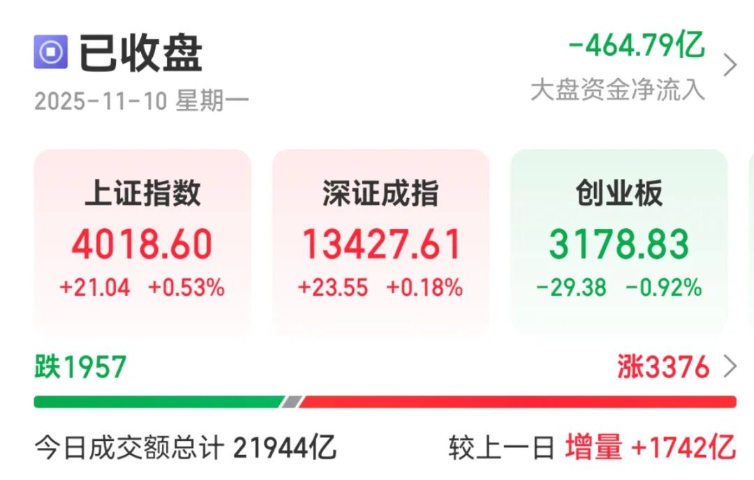 截至收盘,上证指数涨0.53%,深证成指涨0.18%,创业板指跌0.92%。全市场成交额超2.19万亿元,较上一个交易日放量1742亿元。