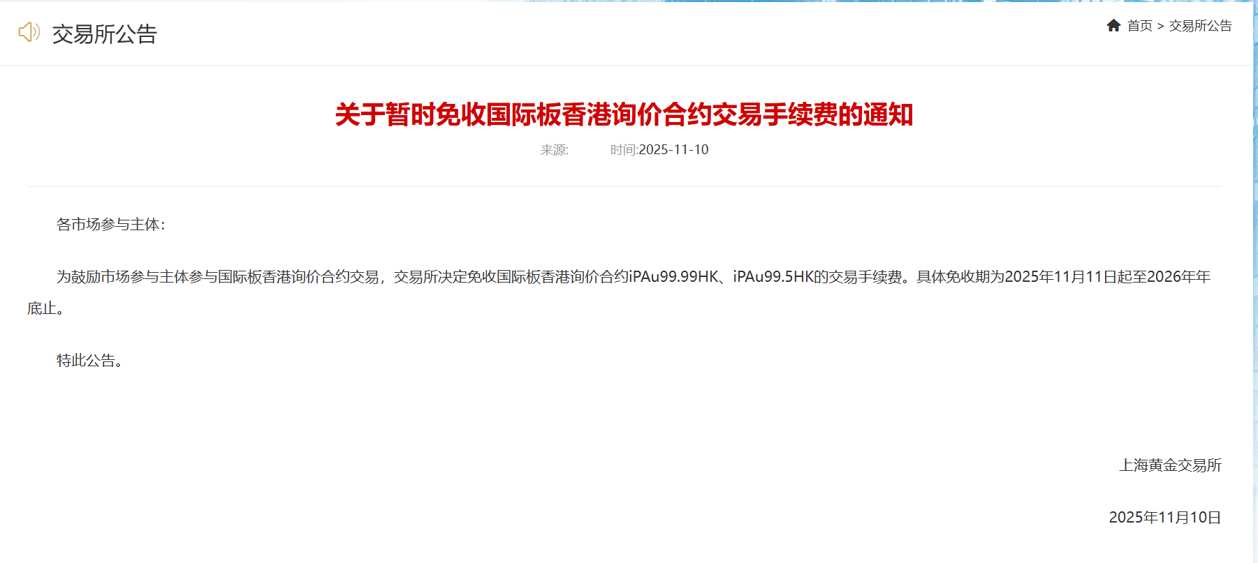 上金所发布通知,为鼓励市场参与主体参与国际板香港询价合约交易,交易所决定免收国际板香港询价合约iPAu99.99HK、iPAu99.5HK的交易手续费。具体免收期为2025年11月11日起至2026年年底止。