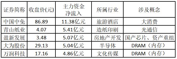 从主力资金来看,今日涨停板个股中,主力资金净流入金额排名前5的个股分别为中国中免、青山纸业、盈新发展、大为股份、万润科技。