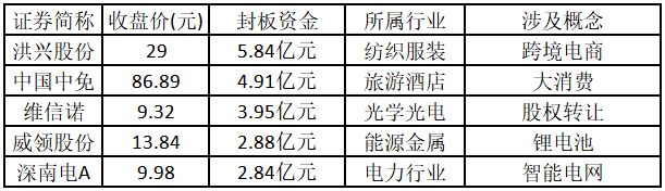 从封板资金来看,今日涨停板个股中,封板资金排名前5的个股包括洪兴股份、中国中免、维信诺、威领股份、深南电A。