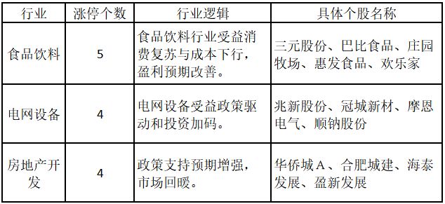 从行业特征来看,今日涨停板个股中,食品饮料、电网设备、房地产开发行业的个股最多。
