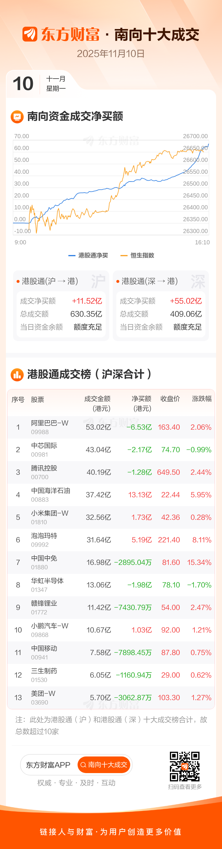 11月10日南向资金净买逾66亿港元,逾13亿抢筹中国海洋石油