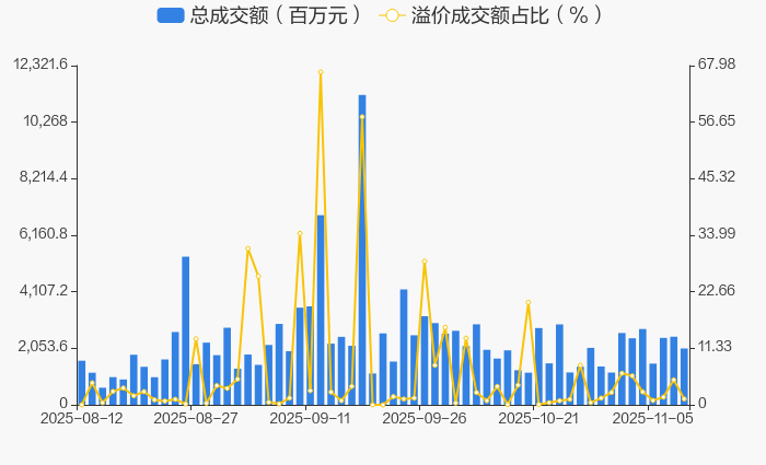 2025年11月10日沪深两市73只个股发生141笔大宗交易,共成交20.48亿元。其中,沪市35只个股共65笔大宗交易,总成交额为14.21亿元;深市36只个股共74笔大宗交易,总成交额为6.16亿元。沪指当日收盘报4018.60点,上涨0.53%,成交金额9605.89亿元。