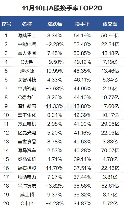 当天换手率最高的个股为海陆重工,全天换手率54.19%。中能电气紧随其后,全天换手率52.4%。