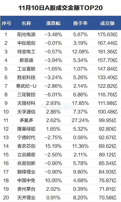 沪深两市成交额2.17万亿元,较上一交易日放量1754亿元。个股方面,阳光电源当日成交175.63亿元。中际旭创当日成交167.44亿元。