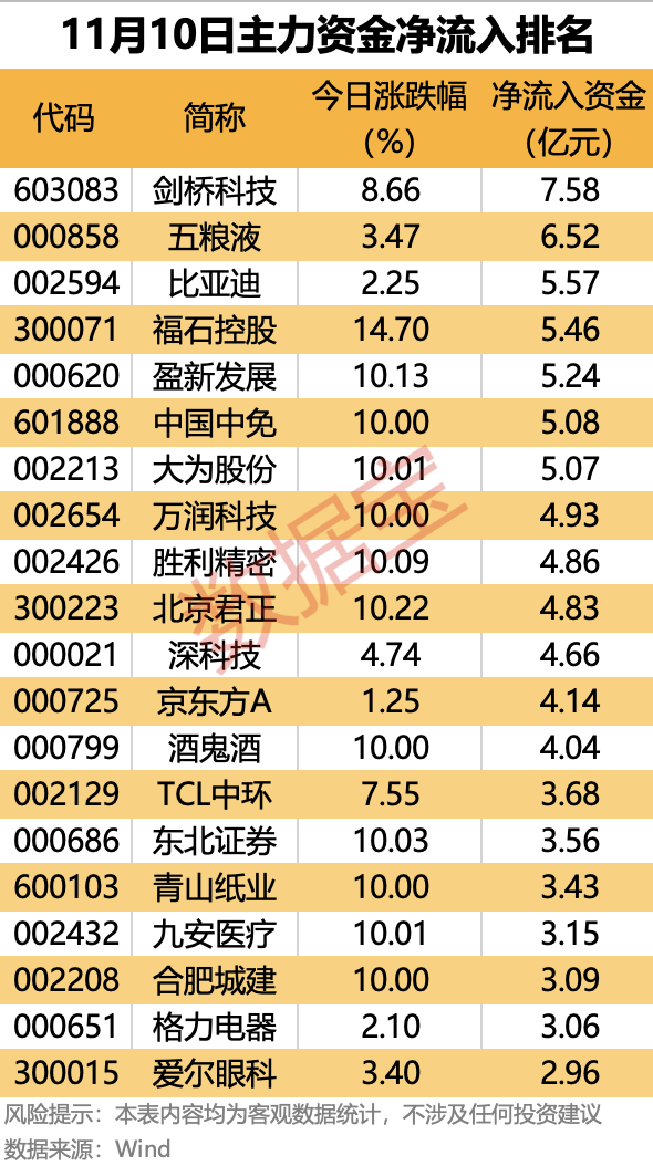 此外,比亚迪、福石控股、盈新发展、中国中免、大为股份、万润科技、胜利精密等主力资金净流入居前,其中多股涨停。