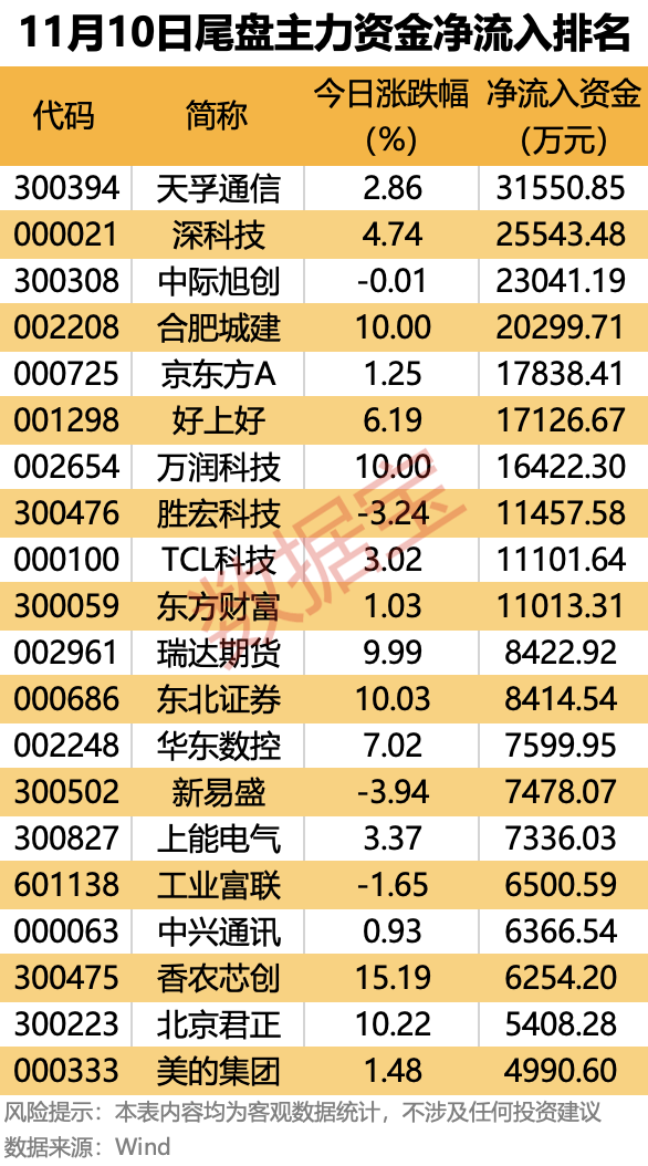 深科技、中际旭创、合肥城建尾盘主力资金净流入金额居前,均超2亿元;其中,合肥城建涨停。