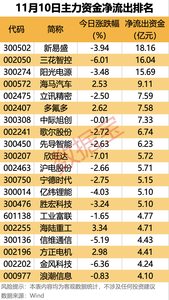 人形机器人龙头三花智控和储能龙头阳光电源主力资金分别净流出16.04亿元、15.69亿元。