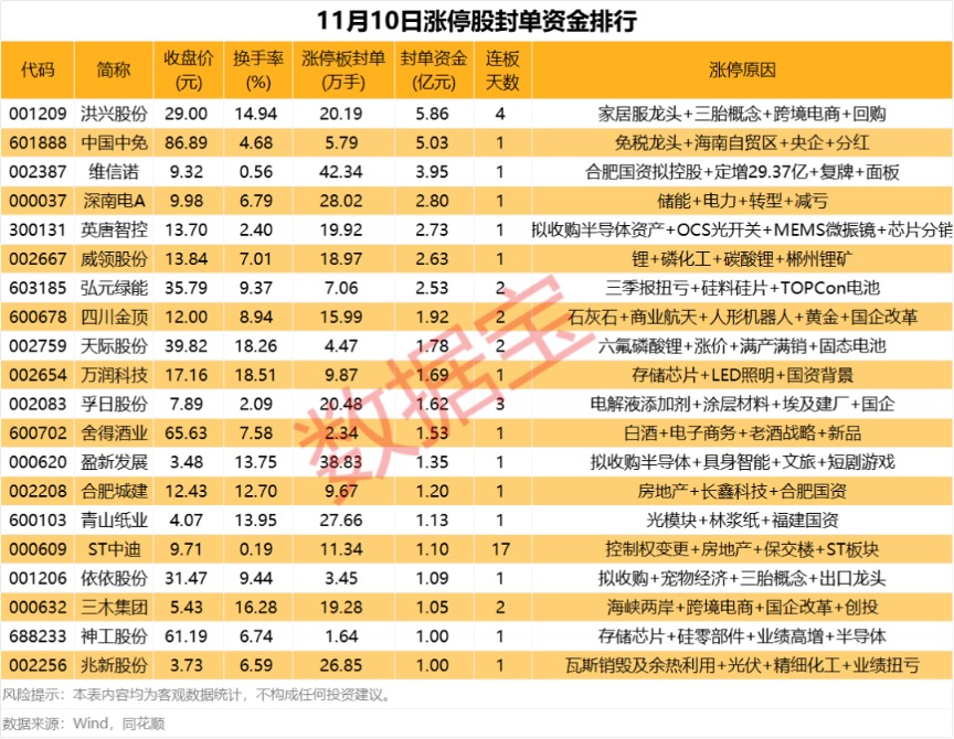 以封单金额计算,20股封单资金超过1亿元。其中,洪兴股份、中国中免、维信诺排名前三,金额依次为5.86亿元、5.03亿元、3.95亿元;深南电A、英唐智控、威领股份和弘元绿能封单金额在2亿元以上。