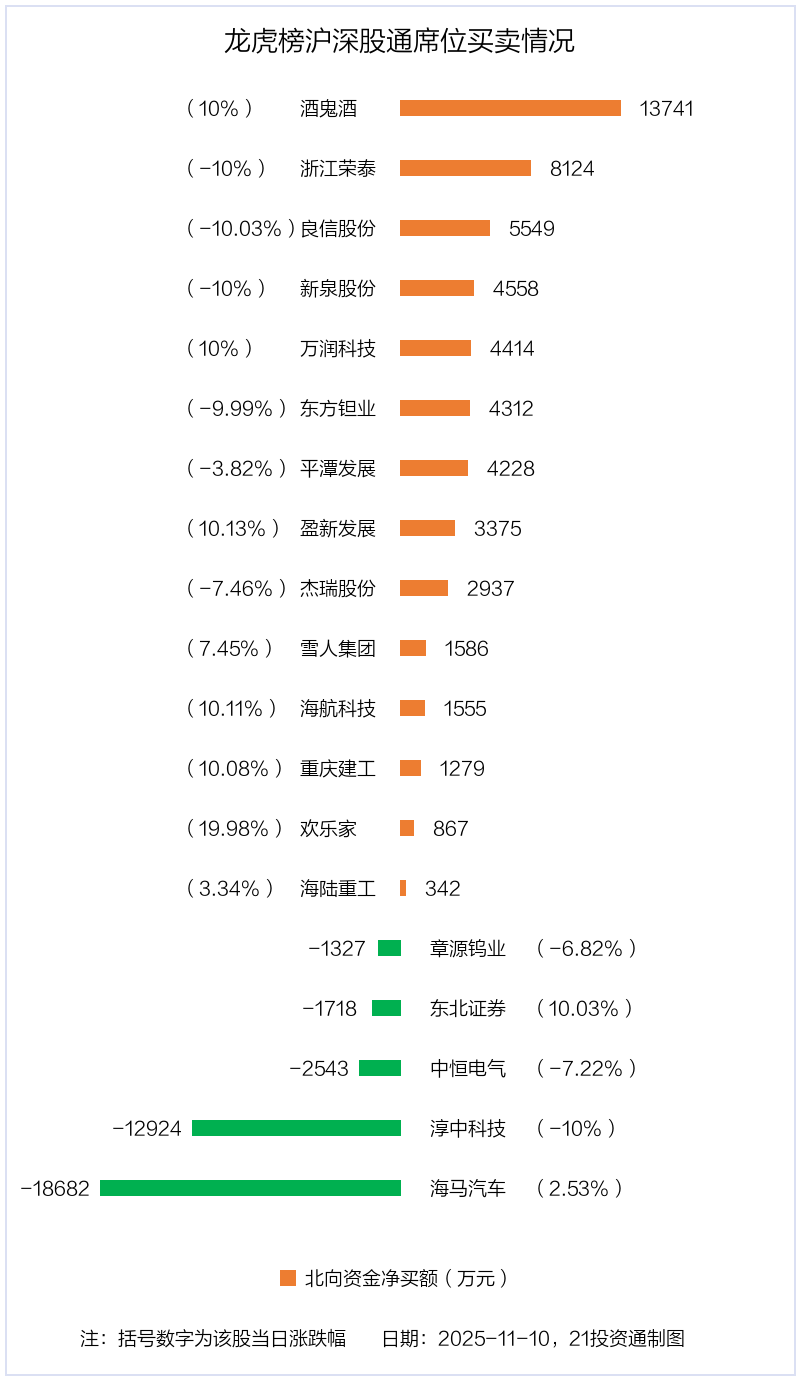 11月10日,北向资金参与龙虎榜中的个股共有19只,合计净买入1.97亿元。其中沪股通净买入4股,净卖出1 股,合计净买入2592.15万元;深股通净买入10 股,净卖出4 股,合计净买入1.71亿元。