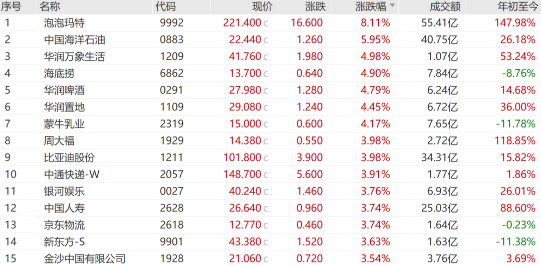 恒生指数成份股中78只上涨,9只下跌。泡泡玛特大涨8.11%,中国海洋石油涨5.95%,华润万象生活涨4.98%,领涨蓝筹。跌幅方面,中国宏桥下跌1.24%,联想集团下跌1.17%,领跌蓝筹。