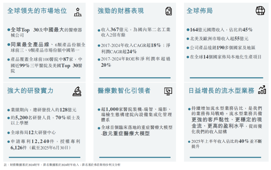 招股书显示,迈瑞是全球领先、创新驱动的世界级医疗器械企业及医疗数智化引领者。根据弗若斯特沙利文的资料,在中国医疗器械行业,迈瑞2024年的市值规模超过境内主要龙头企业(第二名到第五名)之和,工业收入是第二名的两倍有余。迈瑞已跻身全球顶尖医疗器械企业第23名,同时排名不断上升,是全球前30大医疗器械企业中唯一上榜的中国企业,也是从成立到上榜最快的企业之一。
