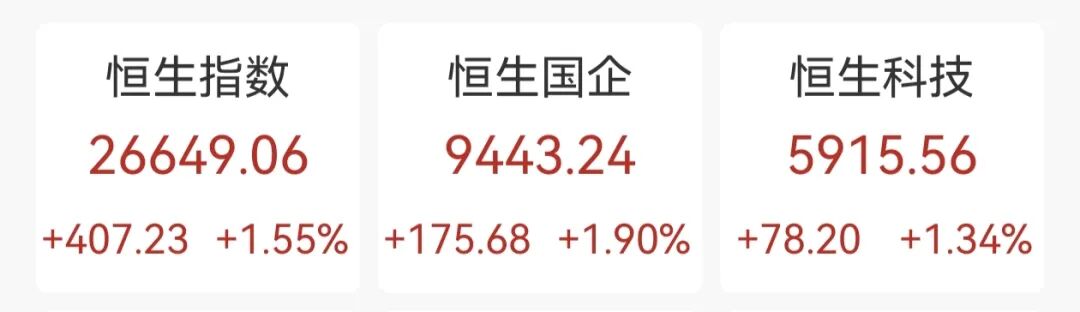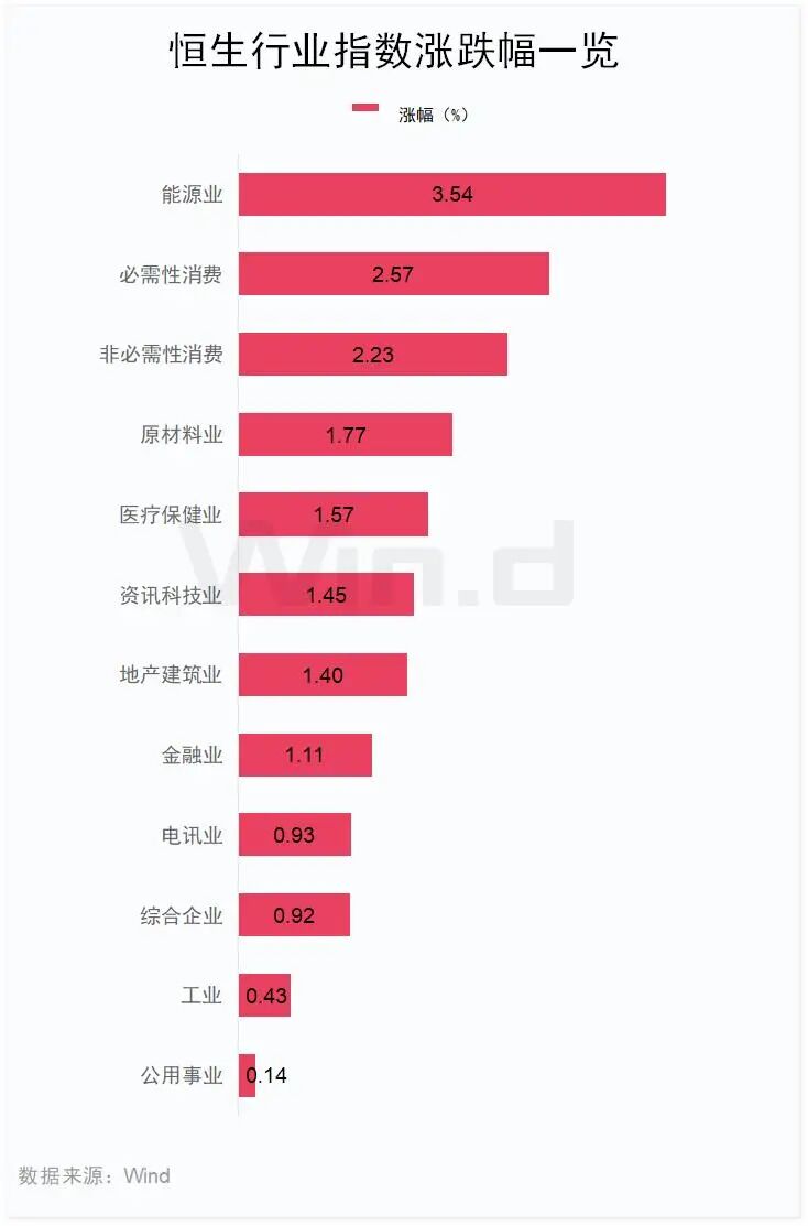 恒生行业指数方面,能源业指数上涨3.54%,必需性消费行业指数上涨2.57%,非必需性消费行业指数上涨2.23%。跌幅方面,机械行业指数下跌1.54%,半导体行业指数下跌0.99%。