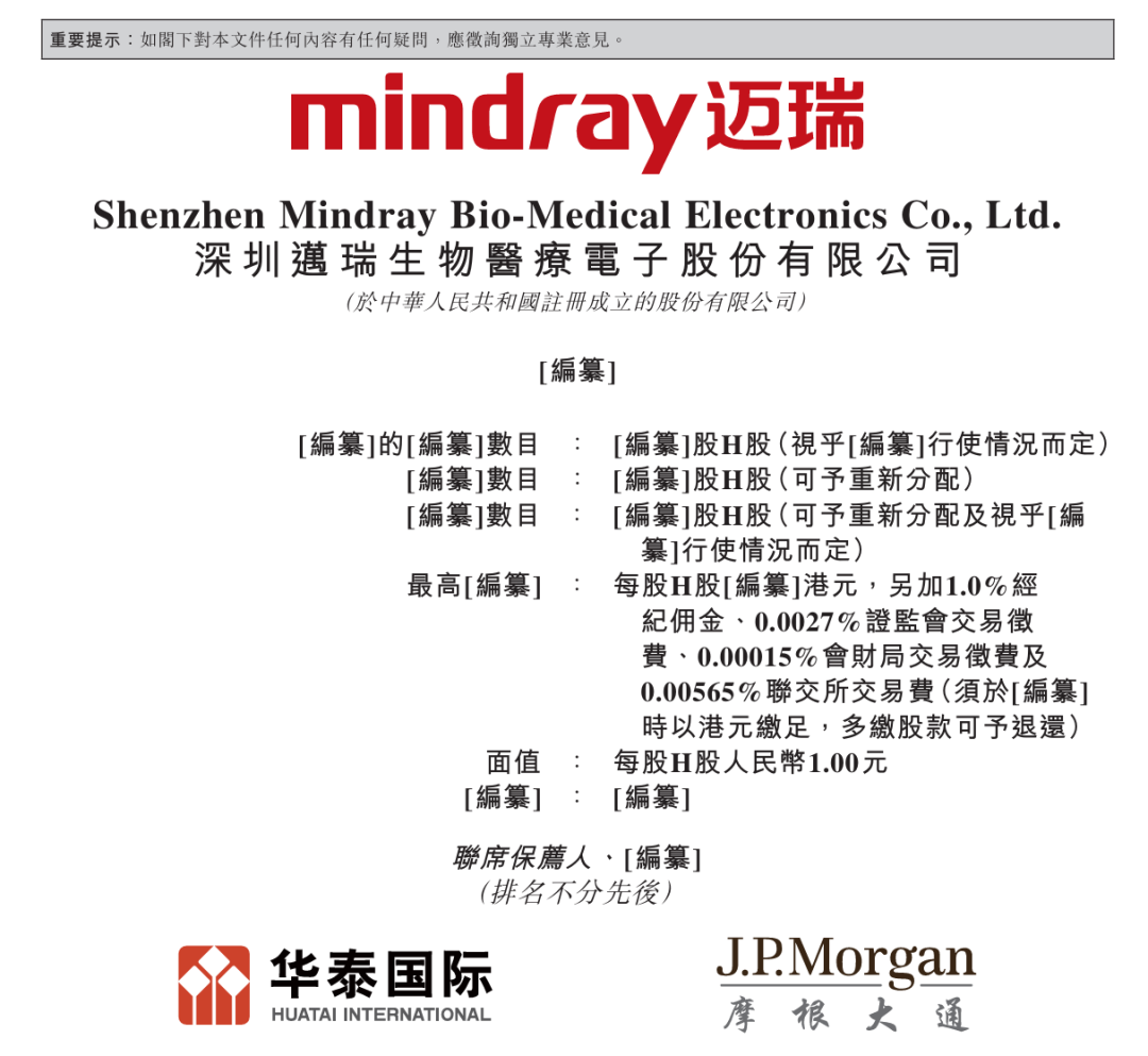 据港交所文件,深圳迈瑞生物医疗电子股份有限公司(以下简称迈瑞)于11月10日,向港交所提交上市申请,华泰国际、摩根大通为联席保荐人。