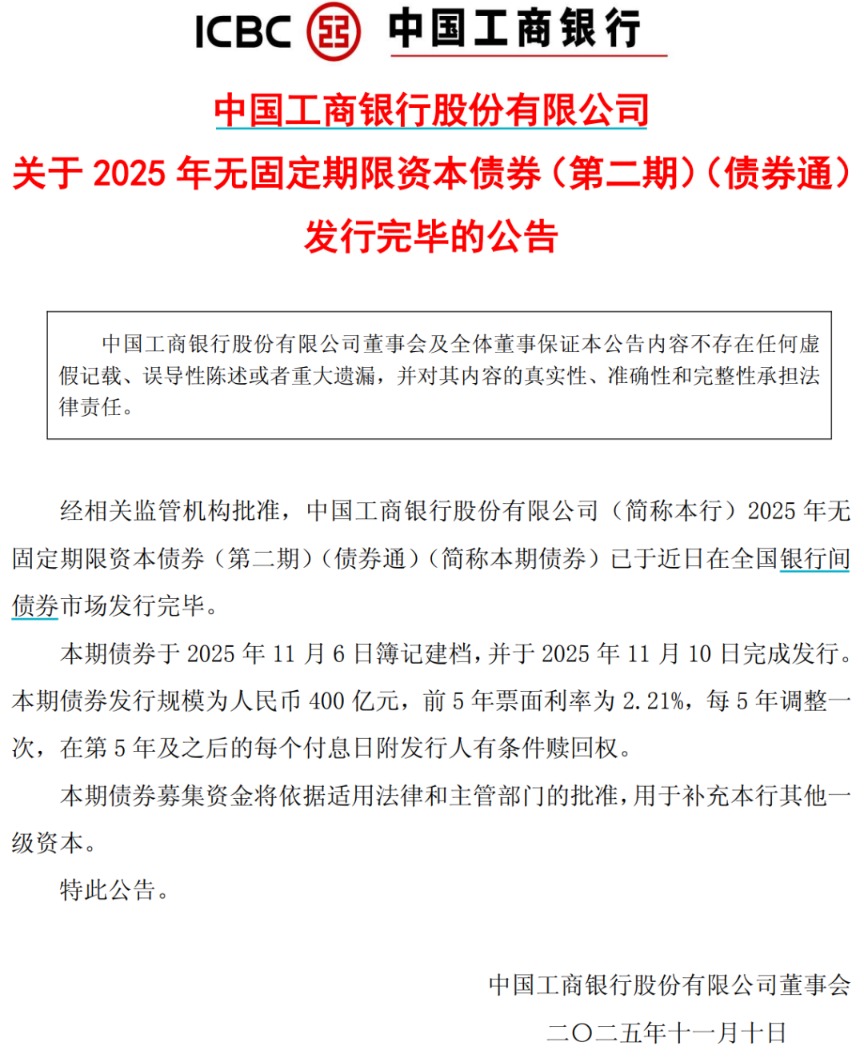 工商银行11月10日公告称,该行2025年无固定期限资本债券(第二期)(债券通)已于近日在全国银行间债券市场发行完毕。