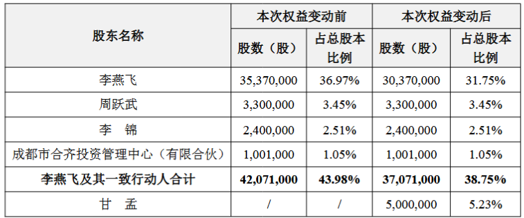 本次协议转让后,李燕飞及其一致行动人持有公司股份3707万股,占公司总股本的38.75%,受让方甘孟持有500万股,占公司总股本的5.23%,具体如下: