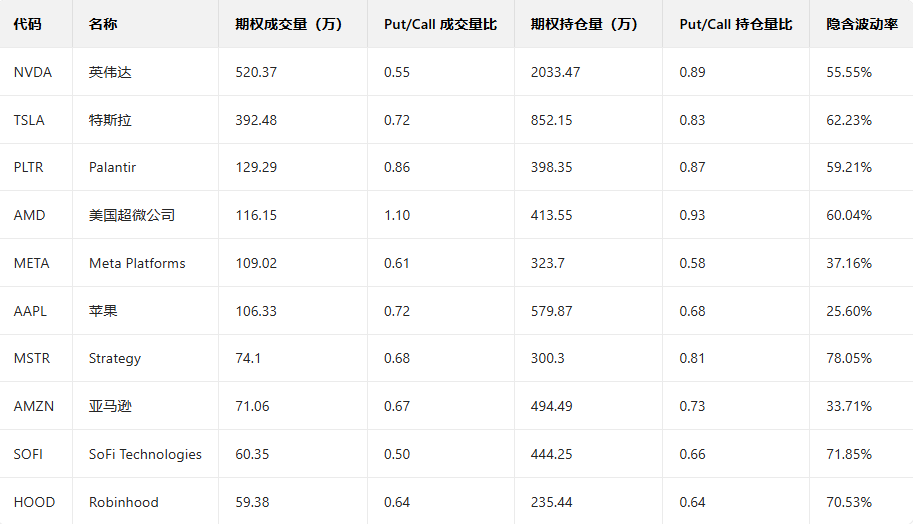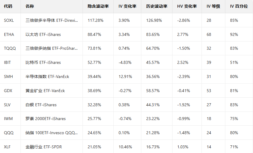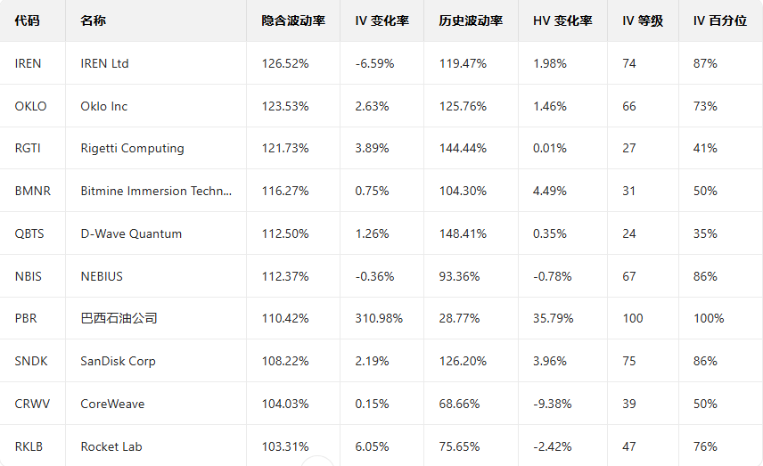 美股引申波动幅度排行榜前十(标的市值>100亿美元,且期权成交量>10万美元)