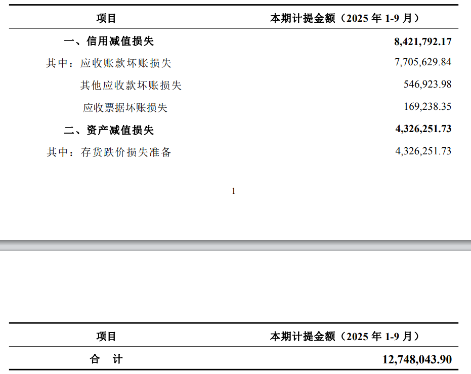 11月10日晚间,佳力奇(301586)发布《关于2025年前三季度计提减值准备的公告》,公司本次计提减值准备合计12,748,043.90元,本次计提减值准备将减少公司2025年前三季度利润总额12,748,043.90元,并相应减少公司报告期期末的资产净值。