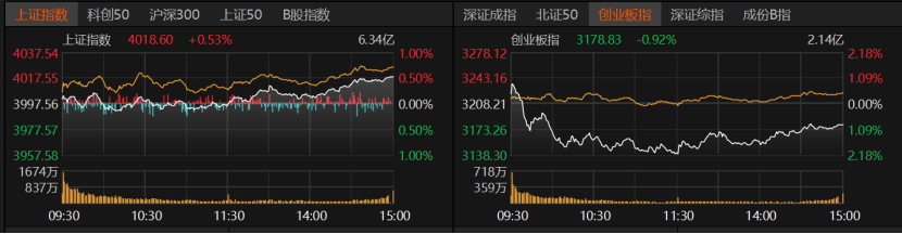 今日,沪指收涨0.53%报4018.6点,创业板指收跌0.92%报3178.83点,深圳成指微红。沪深300、上证50微涨,北证50、科创50微跌。市场资金交投活跃,日成交额增至2.19万亿元。