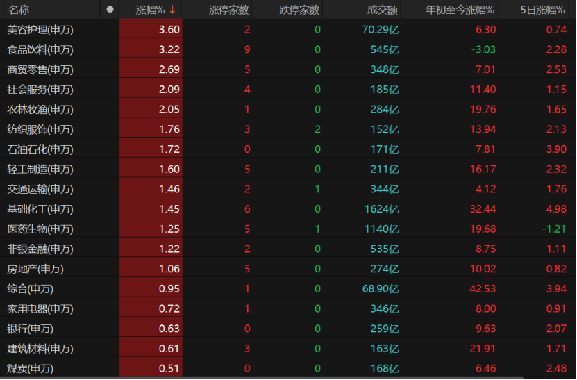 美容护理、食品饮料、商贸零售、社会服务、农林牧渔、纺织服饰、石油石化、轻工制造、交通运输等板块涨幅靠前。个股来看,依依股份涨停,拉芳家化、稳健医疗、嘉亨家化、爱美客涨势不错;中锐股份、集友股份、青山纸业涨停,孚日股份、洪兴股份涨停,首旅酒店、锦江酒店涨停,浙江东日、国光连锁、东百集团涨停。
