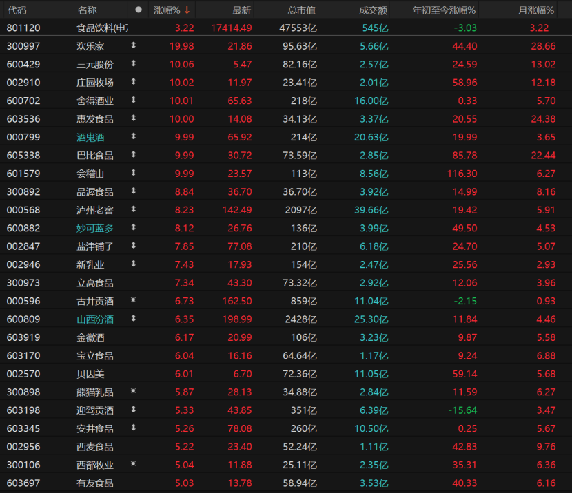 食品饮料板块大涨,欢乐家“20cm”涨停,三元股份、庄园牧场、舍得酒业、惠发食品、酒鬼酒、巴比食品、会稽山涨停。