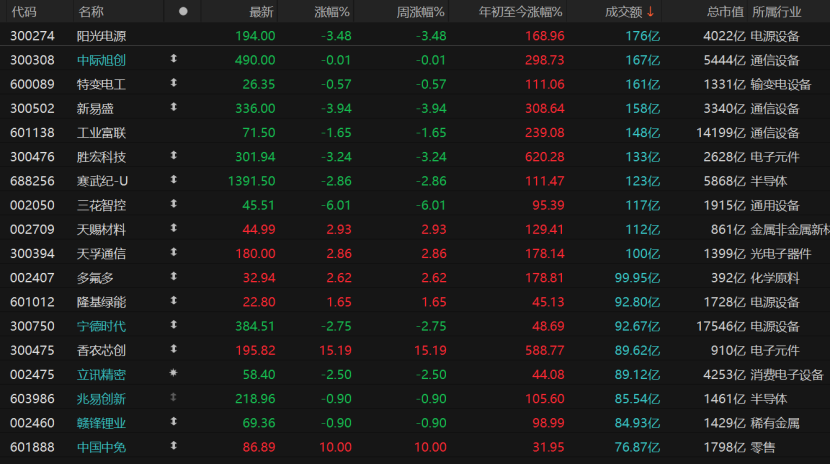日成交额靠前的仍是科技股,阳光电源收跌3.48%报194元/股,宁德时代收跌2.75%报384.51元/股;中际旭创微跌,新易盛跌近4%报336元/股,天孚通信涨近3%报180元/股;近期一路攀高的特变电工今日收跌0.57%;三花智控跌逾6%,寒武纪-U、胜宏科技跌幅均近3%。