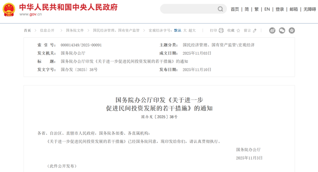 11月10日,中国政府网显示,国务院办公厅印发《关于进一步促进民间投资发展的若干措施》(以下简称《若干措施》),提出13项针对性政策举措,意在进一步激发民间投资活力、促进民间投资发展。