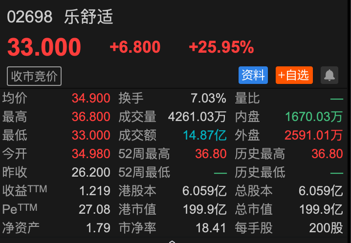 截止10日收盘,乐舒适报收33港元/股,涨幅达25.95%,市值199.9亿港元。