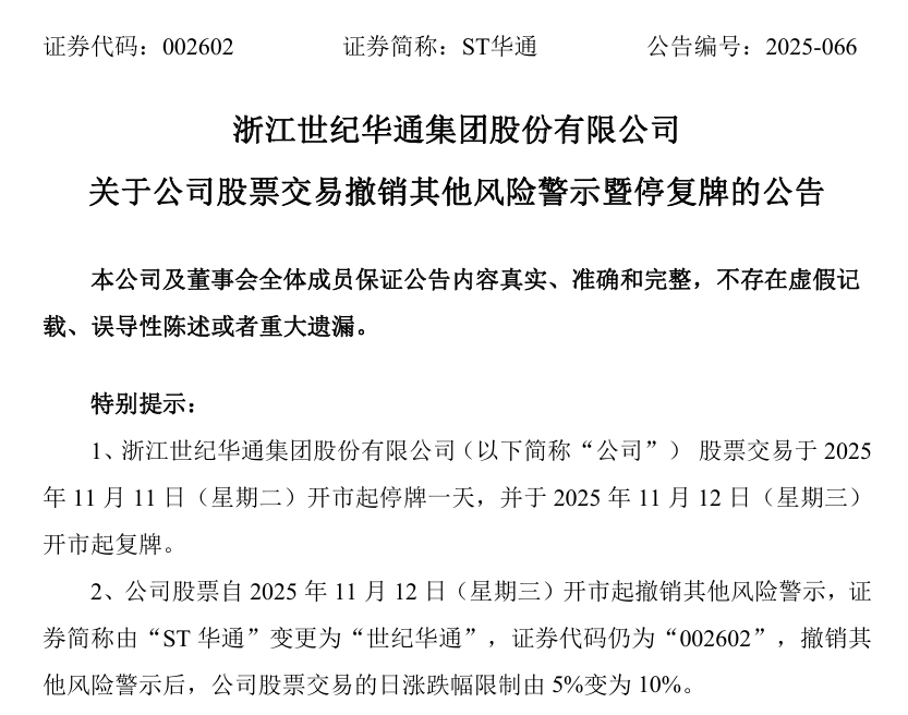 11月10日晚间,浙江世纪华通集团股份有限公司(ST华通,002602.SZ)公告,公司股票交易于2025年11月11日开市起停牌一天,并于11月12日开市起复牌,并撤销其他风险警示,证券简称由“ST华通”变更为“世纪华通”,证券代码仍为“002602”,撤销其他风险警示后,公司股票交易的日涨跌幅限制由5%变为10%。
