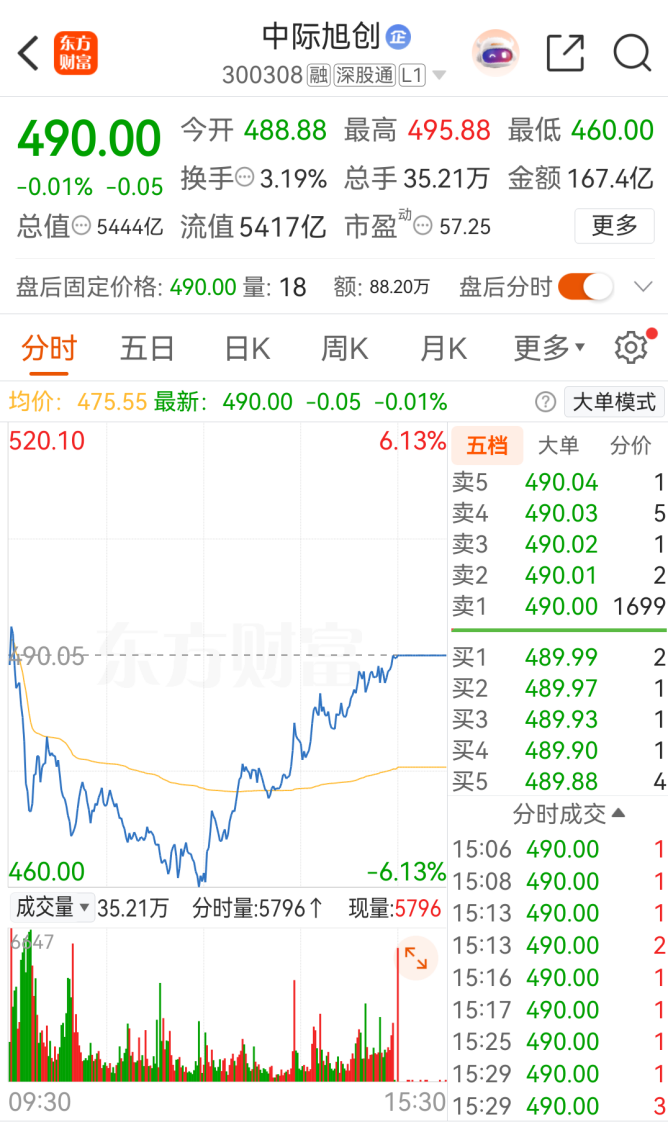 截至11月10日收盘,中际旭创股价报490元/股,总市值为5444亿元。