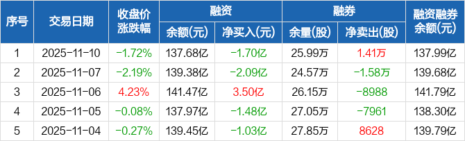 中芯国际融资融券信息显示,2025年11月10日融资净偿还1.7亿元;融资余额137.68亿元,较前一日下降1.22%。