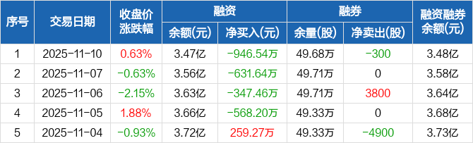 融资方面,当日融资买入810.53万元,融资偿还1757.06万元,融资净偿还946.54万元,连续4日净偿还累计2493.83万元。融券方面,融券卖出0股,融券偿还300股,融券余量49.68万股,融券余额158.48万元。融资融券余额合计3.48亿元。