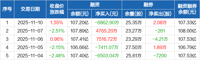 融资方面,当日融资买入1.41亿元,融资偿还2.1亿元,融资净偿还6862.9万元。融券方面,融券卖出3.34万股,融券偿还1.26万股,融券余量25.35万股,融券余额1208.45万元。融资融券余额合计107.33亿元。